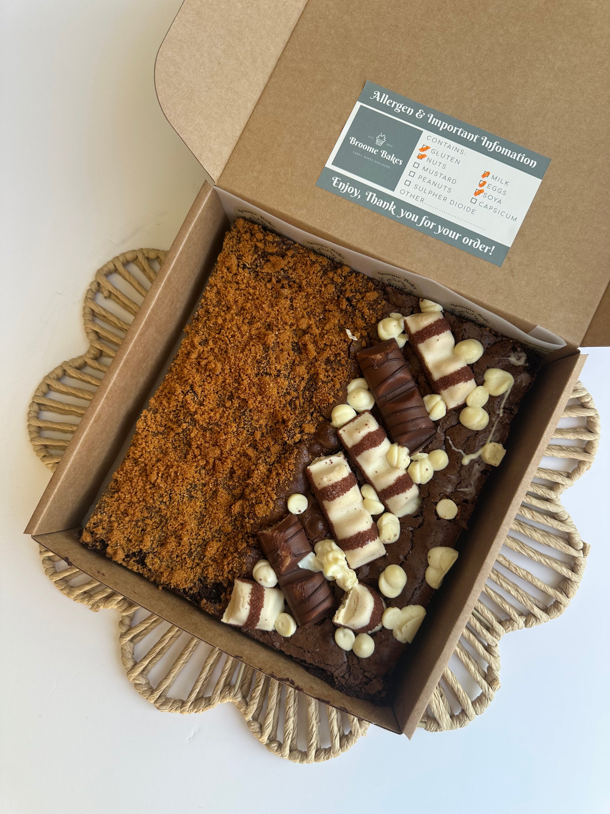 Allergy Advice: Contains eggs, soya, milk and gluten. Peanut butter and Snickers option also includes peanuts. Ferrero, Kinder and Bueno option also includes hazelnuts. All our bakes are made in an environment where cereals containing gluten, milk, eggs, soya, peanuts, nuts, wheat, barley, dairy, sulphur dioxide/sulphites are used. For this reason we cannot guarantee they are free from traces of these allergens and are not suitable for people with allergies or intolerances. Please email me if you need more information regarding the ingredients used - accounts@broomebakes.co.uk